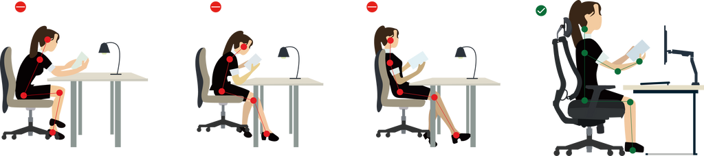 Die Armhaltung und die Höhe der Armlehne haben einen wesentlichen Einfluss auf die Haltung des Oberkörpers. Die Armlehne sollte sich idealerweise auf Höhe der angewinkelten Ellenbogen befinden, sodass der Unterarm entspannt auf ihr aufliegen kann. Ist die Armlehne zu hoch, muss man die Schultern hochziehen. Ist sie hingegen zu niedrig, muss man Arme und Schultern über längere Zeit hängen lassen.